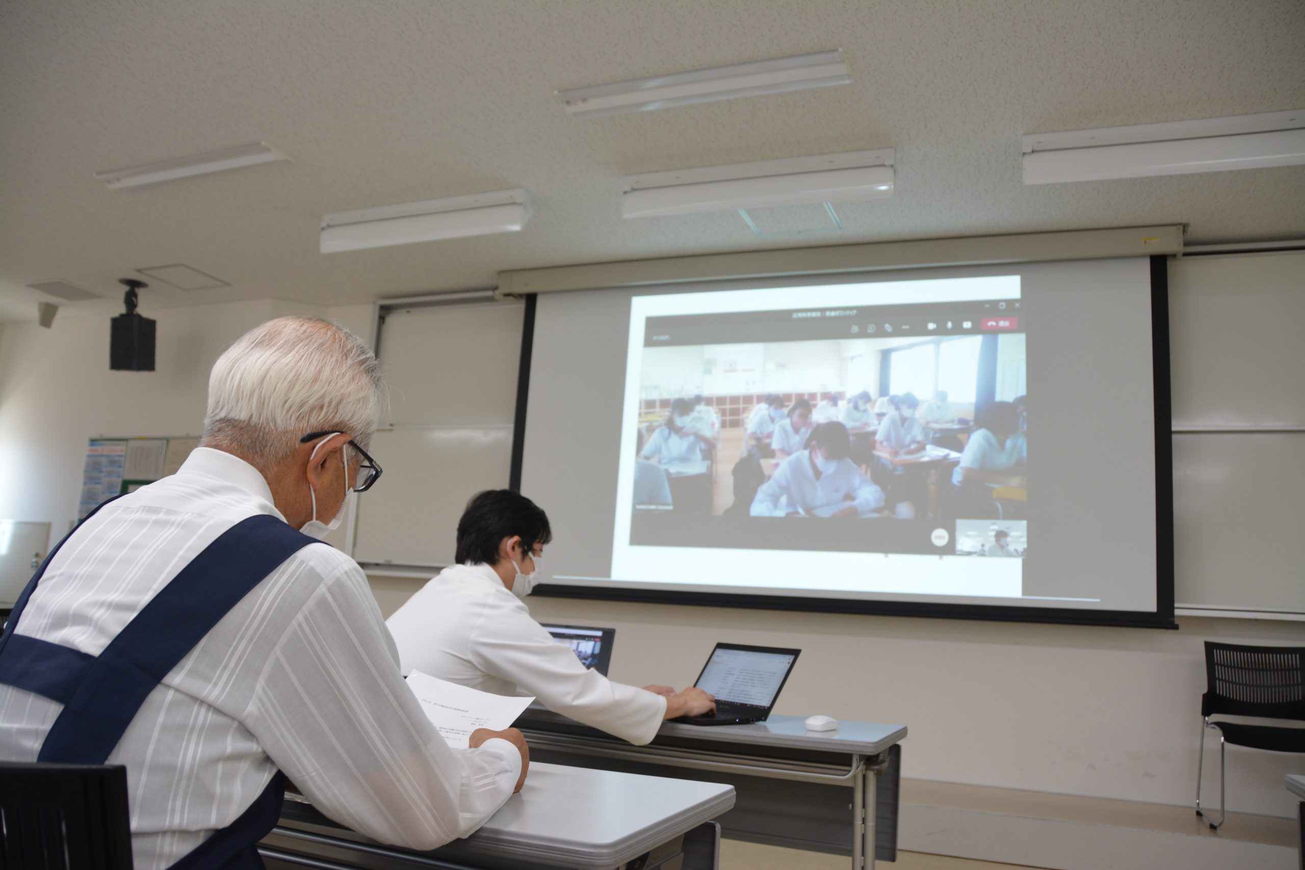 令和3年8月2日(月)、医学部において「医療ボランティア」をテーマとした高大連携プログラム「応用科学探究」を実施し、附属高校2年生15名が参加しました。コロナ禍の影響で令和2年度は中止となり、令和3年度は附属高校と医学部の教室をつないでオンラインでの実施となりました。