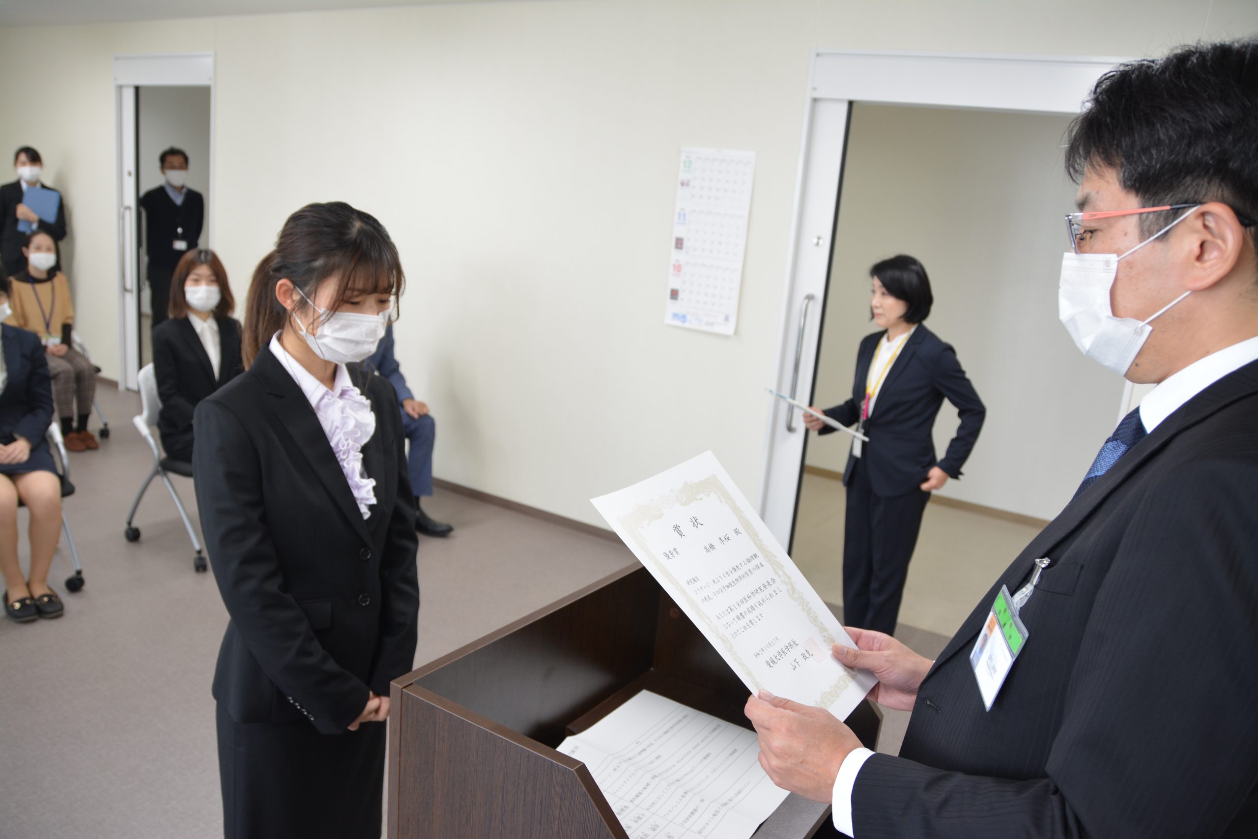 表彰式では、山下政克研究科長から表彰状が授与され、「コロナ禍で十分な研究ができないが、国内外の学会にオンラインで参加できるので、積極的に参加し、トップレベルの研究にふれてください。」と祝辞の言葉が述べられました。