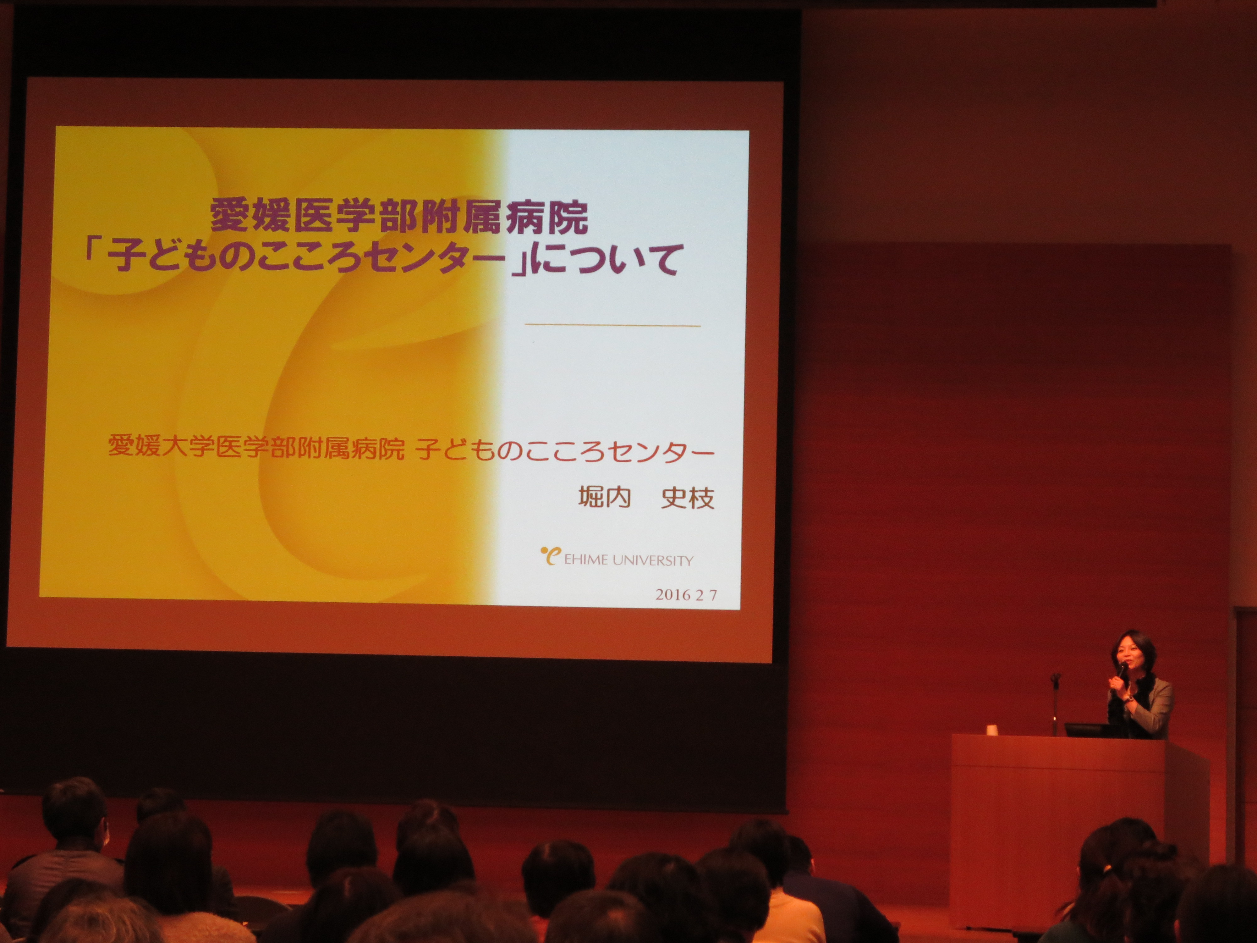 まず,本学医学系研究科精神神経科学講座の上野修一教授から開会の挨拶があり,続いて,医学部附属病院子どものこころセンターの堀内史枝センター長が,センターの設立経緯や受診状況などを説明しました。