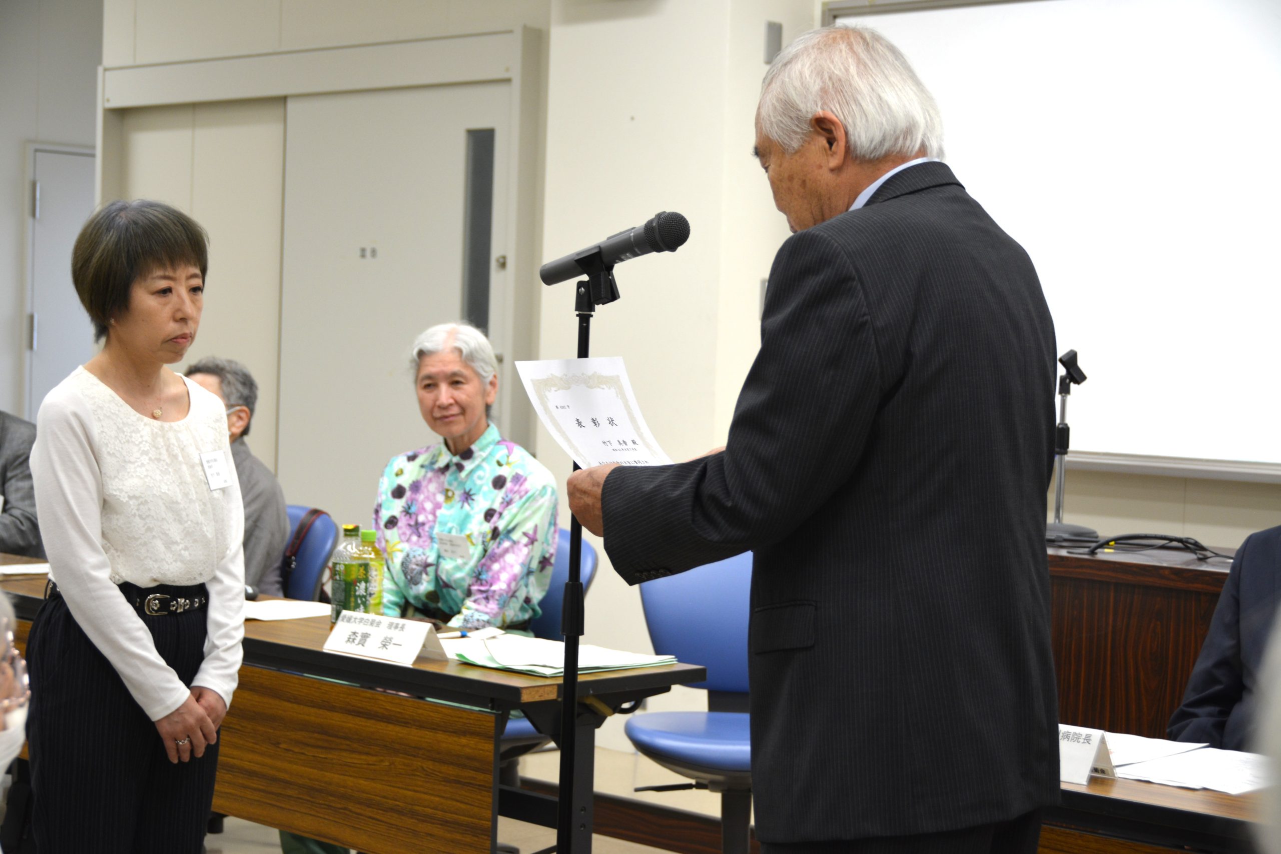 今年度は新たに22人が白菊会会員となり、その代表者に森實理事長から表彰状と、生体構造医学講座の武内教授から感謝状が贈呈されました。