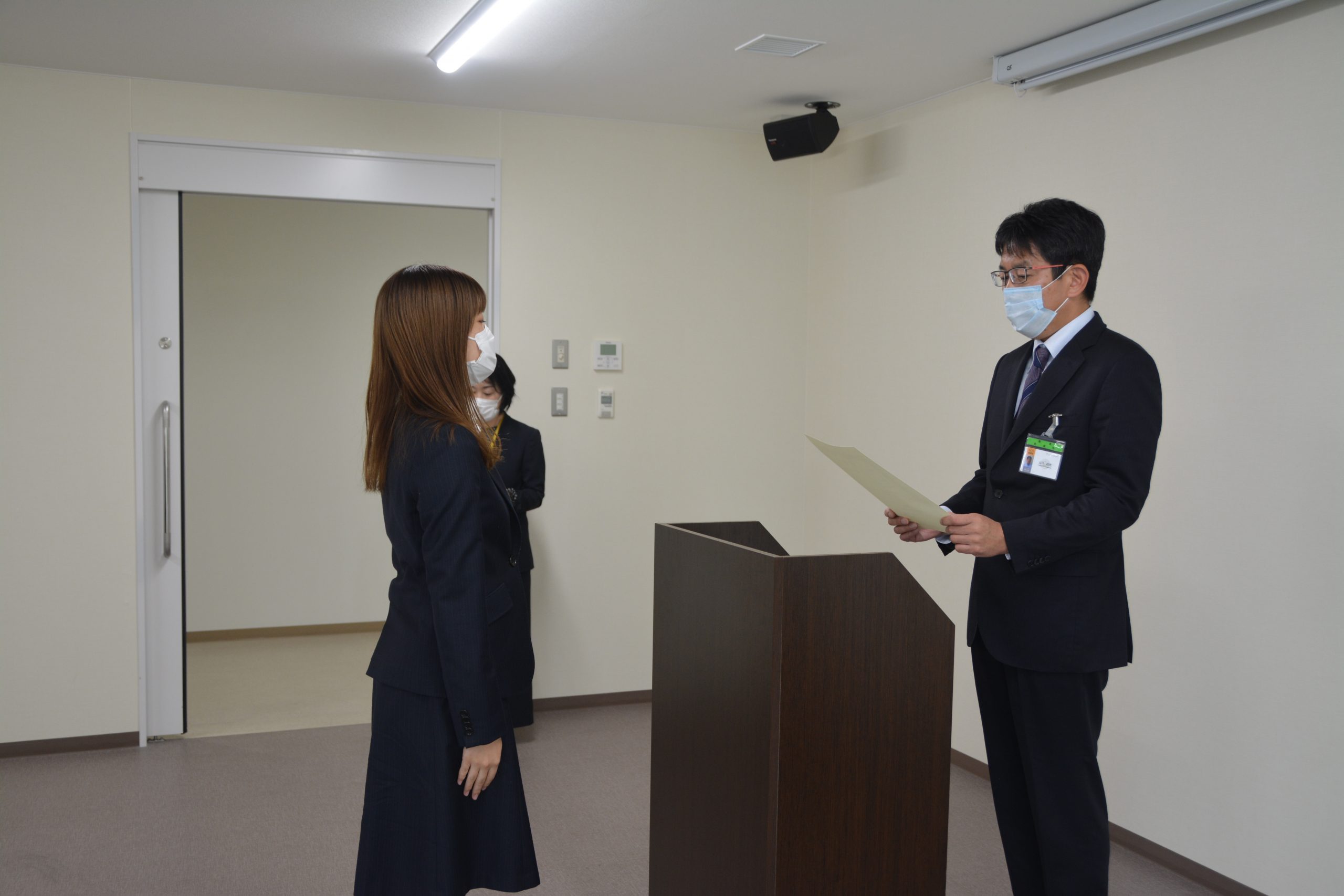 表彰式では、山下政克研究科長から表彰状が授与され、「コロナ禍で十分な研究ができない中、しっかりまとめている。研究においては客観的評価も大切になるため、引き続き発表の機会など積極的に参加し、研究に励んでほしい」と祝辞の言葉が述べられました。