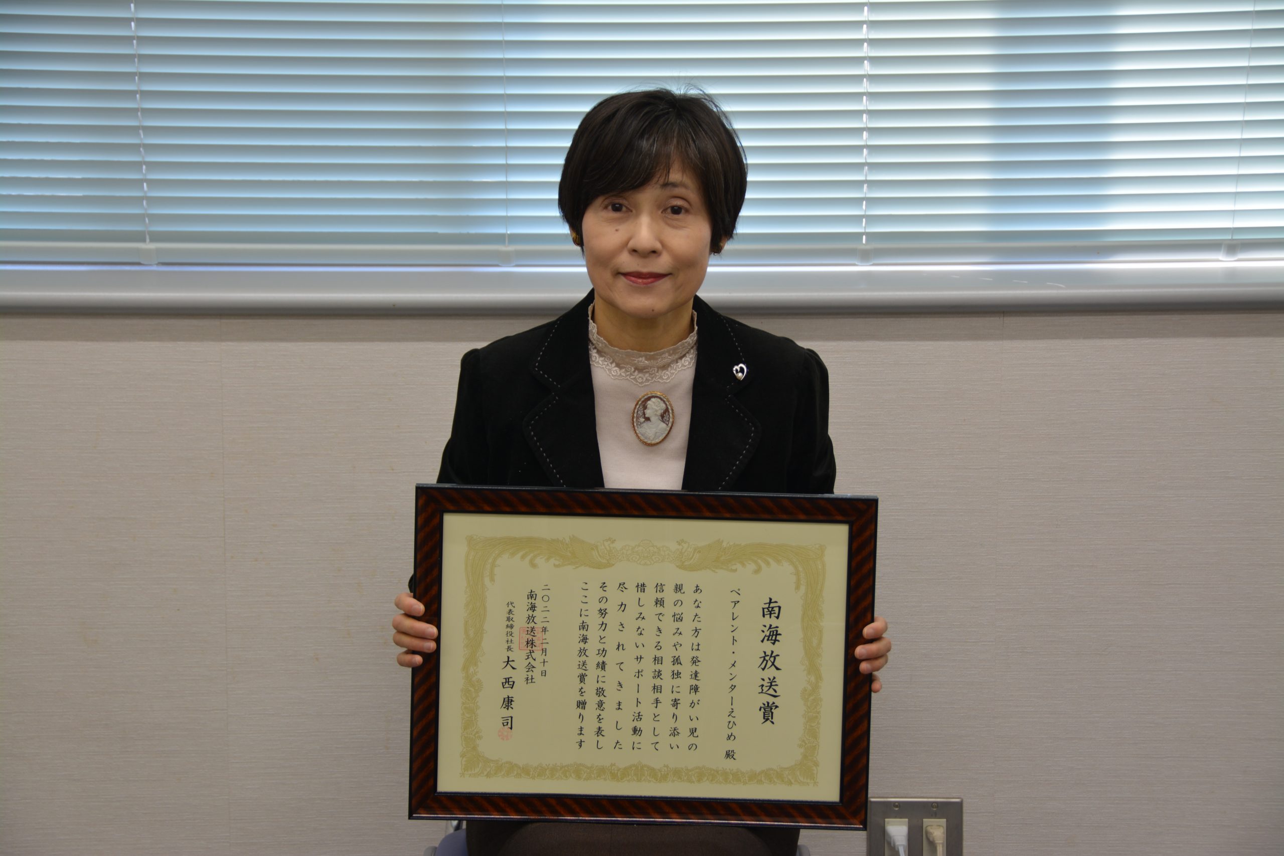 看護学専攻の西嶋真理子教授が代表を務める「ペアレント・メンターえひめ」が、第55回南海放送賞を受賞しました