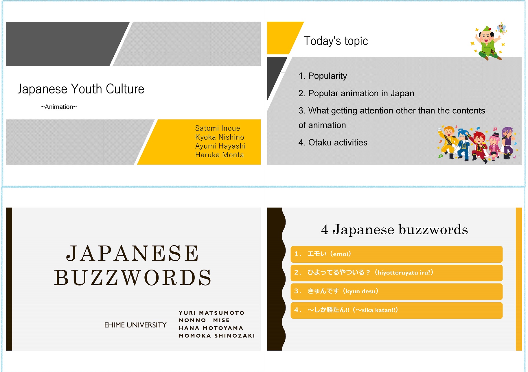 1回目の交流では、愛大側が日本語の流行語と日本の若者文化について英語で発表しました。ジャパンクラブの生徒たちは、CSUSの日本語授業では習わない「エモい」や「キュンです」などの単語を熱心に学びました。CSUS側はジャパンクラブ会長のジョシュア・オパダがサクラメント市について短い紹介を行いました。プレゼンテーションの後は、ブレイクアウトルームに分かれて活発な議論が行われました。