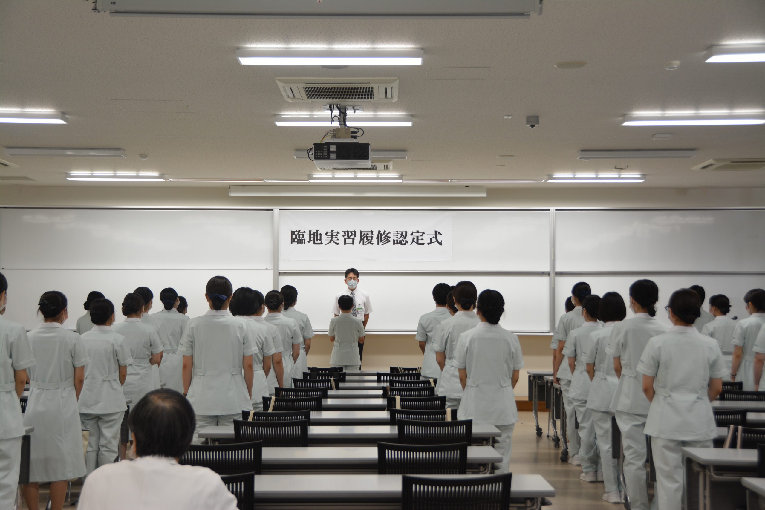 この式典は、3年生前学期までの専門基礎科目、専門科目のうちから卒業に必要な単位を取得し、本格的な臨地実習資格を得た学生に対して、患者と関わるという責任を自覚し、実習に向けての心構えを持つことを目的としており、今年度は3年生57人が認定を受けました。