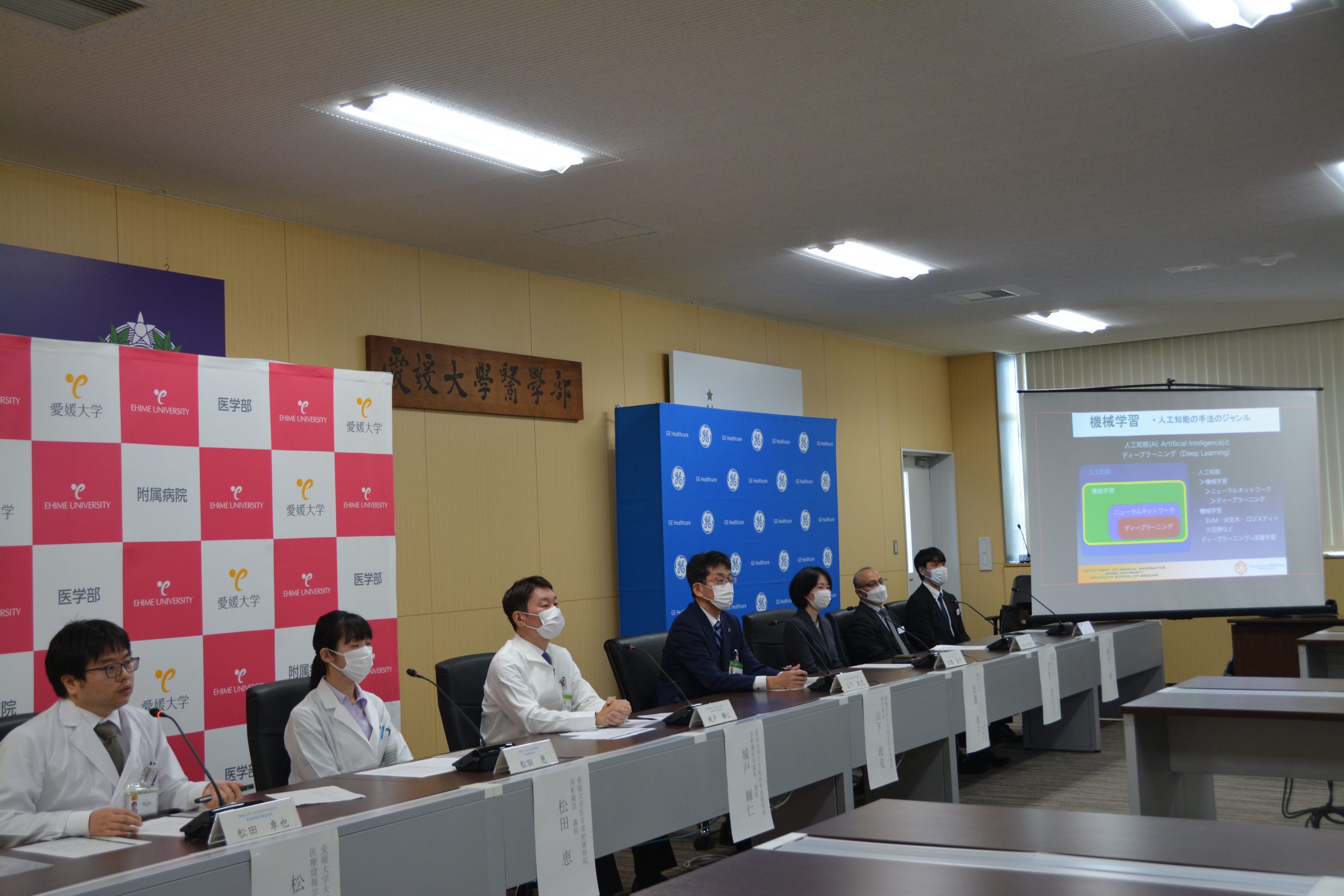 この会見は、愛媛大学大学院医学系研究科の城戸教授とGEヘルスケア・ジャパン株式会社の共同研究にて、近年世界中で注目されている乳がん診断について、乳腺病変の良悪性鑑別の精度向上に向けて、人工知能技術を使用した診断技術を開発し、その初期検討結果を発表したものです。