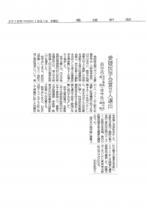 第26回愛媛医学会賞および第9回愛媛医学会奨励賞の受賞者が、愛媛新聞(2018年1月31日付)に掲載されました。