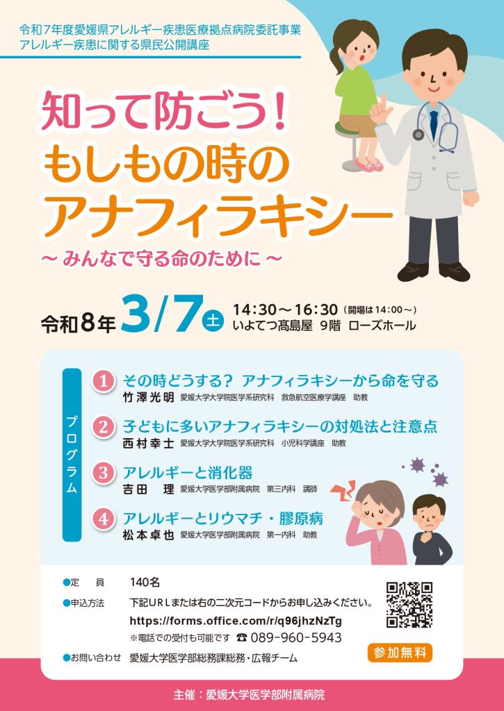 令和8年3月7日(土)14時30分から、いよてつ髙島屋9階ローズホールにて、県民公開講座「知って防ごう!もしもの時のアナフィラキシー~みんなで守る命のために~」を開催します。