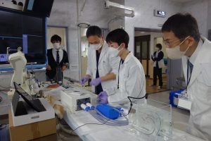 その後、研修医の控室にて、学生たちはシミュレータを用いた手技を、研修医の直接のご指導のもとで体験しました。大木元副院長からは、「へき地を言い訳にしない」という力強いメッセージをいただきました。地域医療の中核を担う重要な医療機関での貴重な体験を通じて、学生たちは終始意欲的に取り組み、熱心に学び続けていました。