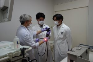 四国中央病院では、香川先生に内視鏡シュミレータの操作方法を指導していただき、実際に操作体験をさせていただきました。参加学生は、両手を使う操作に四苦八苦しながらも真剣にチャレンジしていました。