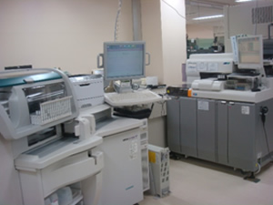 採血された検体は、中央採血室隣の検体検査室に運ばれ、直ちに検査を開始します。約1時間後、コンピュータにて結果を報告し、外来診療に間に合うように検査を実施しています。