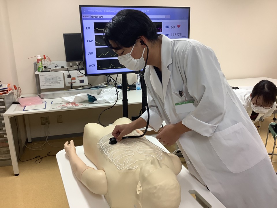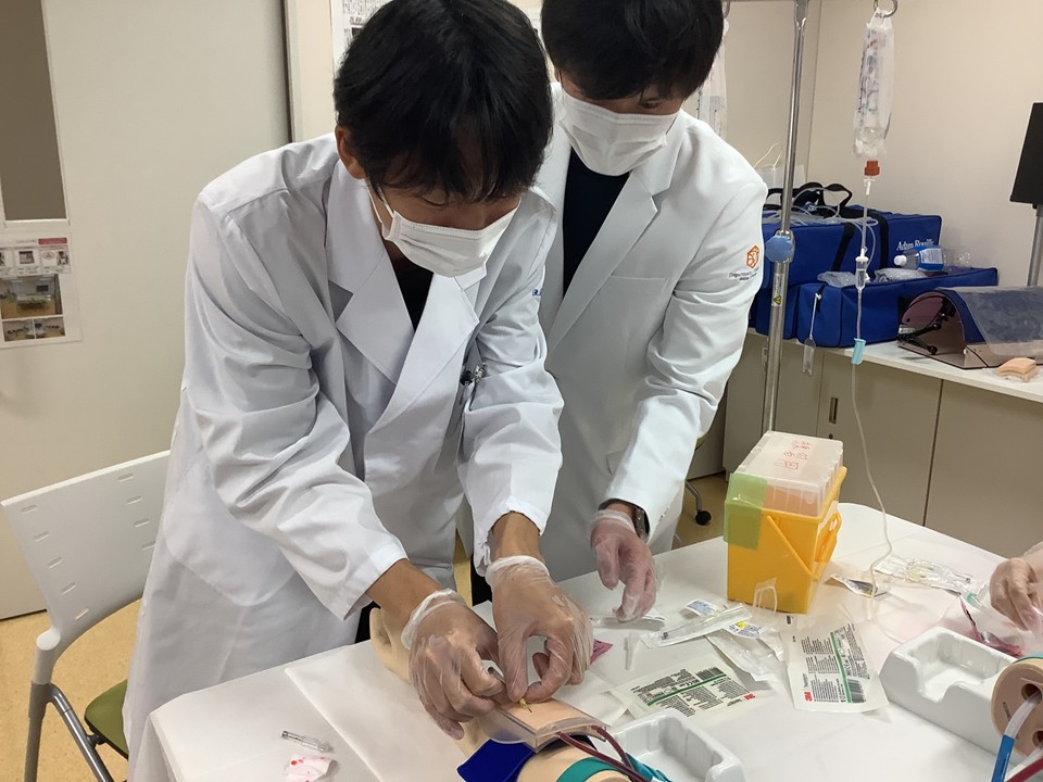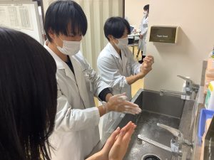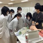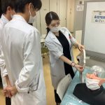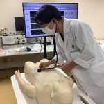 初日には「感染対策」および「ICUでの救急患者対応」に関するVRコンテンツを視聴しました。2日目以降の「シミュリンピック実習」(2日目~4日目)では、各講師の指導のもとシミュレータを用いて手洗い、手指消毒・簡易PPEの着脱、鼻腔咽頭ぬぐい、胸部聴診、ルート確保、バルーン留置カテーテルおよび気管挿管について学びました。