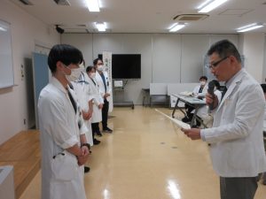 歯科研修医代表に修了証が手渡されました。続いて、医科臨床研修プログラム責任者の熊木センター長