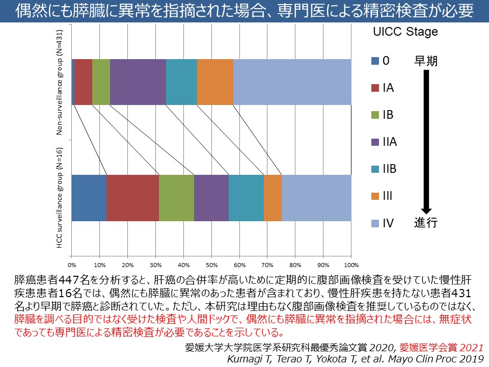 熊木教授は、愛媛胆膵疾患研究グループ(※1)を10年前に設立し、特に膵癌について県内の専門医とともに研究しています。今回の受賞は、膵臓を調べる目的ではなく受けた検査や人間ドックで膵臓に異常を指摘された際に、無症状であっても専門医のもとで精密検査を受けることこそ、膵癌の早期診断に繋げられることを示したものです。