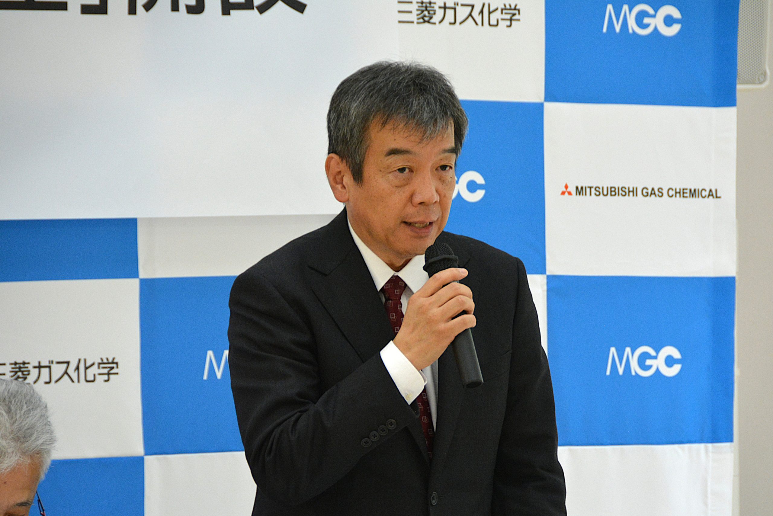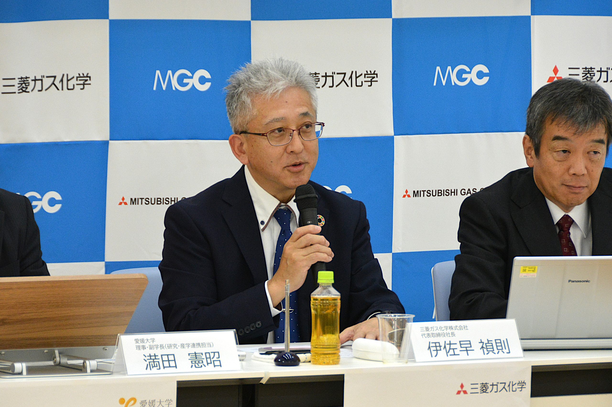 記者説明会では、まず初めに、満田憲昭研究・産学連携担当理事・副学長から、本講座設置の目的と意義について説明がありました。続いて、三菱ガス化学株式会社の伊佐早禎則代表取締役社長から、会社概要及び主な事業内容、また、生産品目の90%以上が自社開発技術によるものであることや、世界シェアーナンバーワンの製品を数多く扱っていることなどが、代表的な商品とともに紹介されました。最後に、同社の東友之常務執行役員から、研究開発方針とその中における本取組の位置づけと意味合い、特に化学会社が医療分野での研究開発を行う目的と意義について説明がありました。