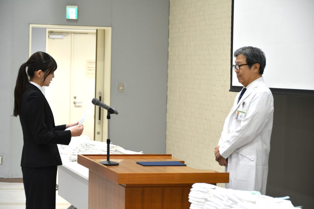 開会にあたり、羽藤直人医学部長から医師の道を進む者への激励の言葉があり、これに対し、学生代表の安部華子さんが、臨床実習に臨む決意を述べました。