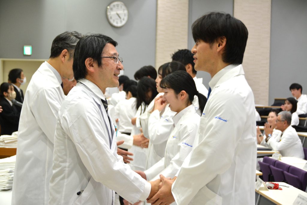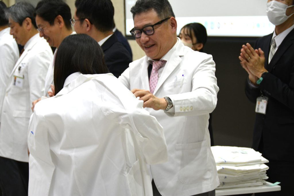 最後に、10人の教授が学生一人一人に白衣を羽織らせ、激励をしました。学生の反応は、笑顔で記念撮影を行う人、緊張した面持ちで白衣に袖を通す人など、自身が医師になることに近づいていることへの喜びと不安を感じている様子が見て取れました。