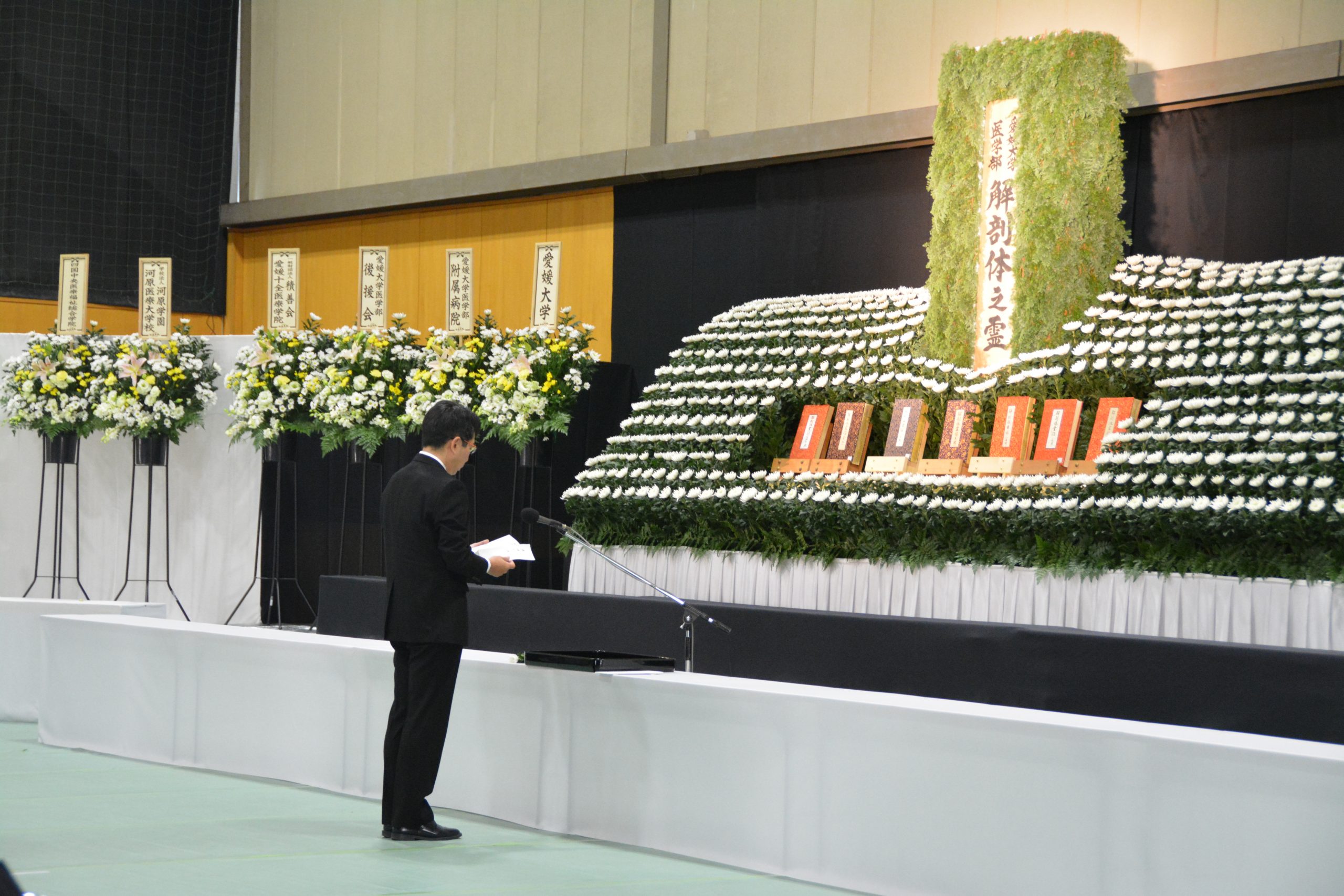 これに続き、山下政克医学部長、杉山隆副病院長、森實榮一白菊会理事長及び学生代表の大島美麗さん(医学科3年生)が、篤志をもって医学教育にその身を捧げてくださった方の御霊と、その志を理解してくださった御家族に感謝と追悼の辞を述べました。