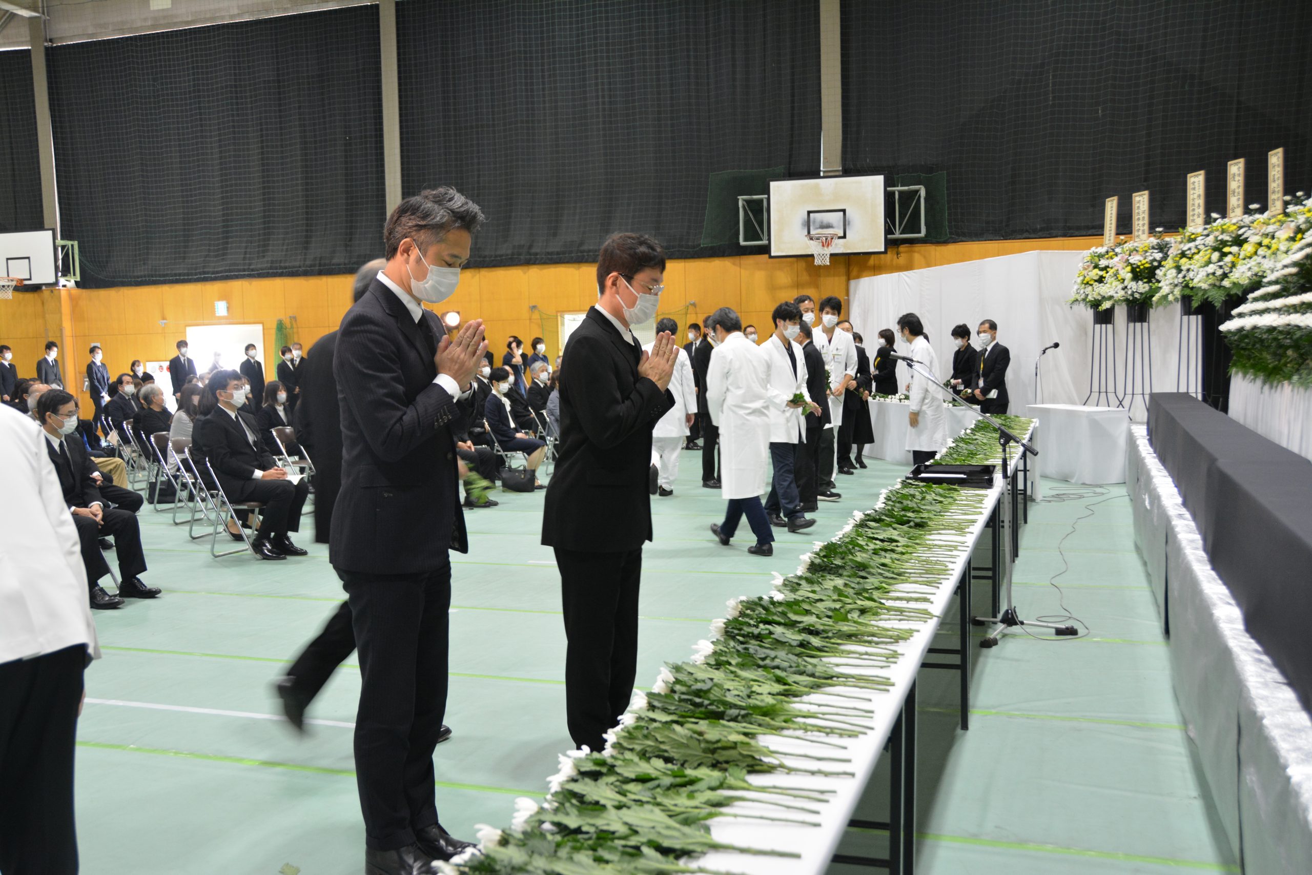 今年度の慰霊祭では、新型コロナウイルス対策として参加者を制限し、約250人の御遺族、白菊会会員、来賓、教職員、学生等が参列しました。式典では、献体者の御芳名が奉読された後、医学の発展のために貢献していただく尊い御霊(みたま)に対し、感謝と哀悼の意を表し黙祷しました。