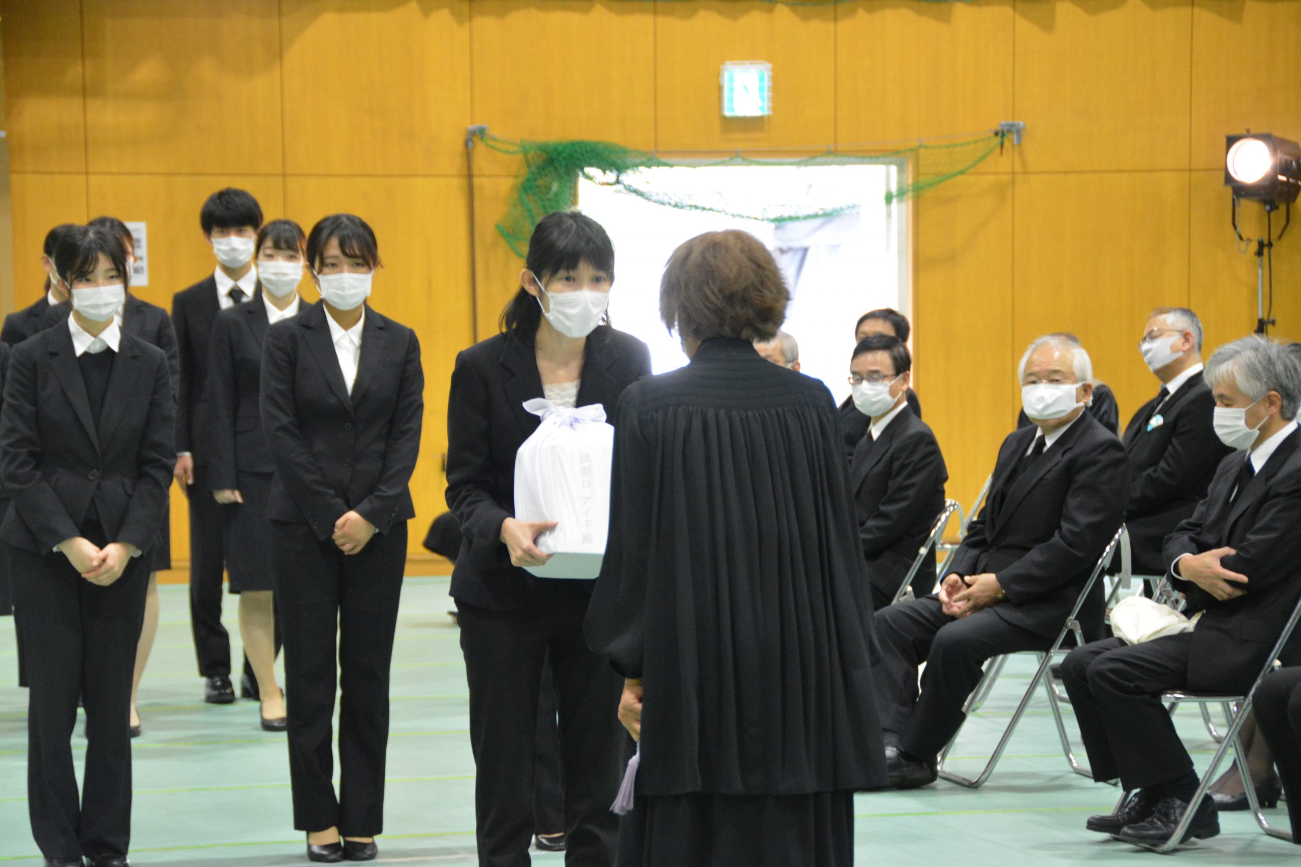 慰霊祭終了後、文部科学大臣感謝状伝達式を行い、山下医学部長から御遺族に文部科学大臣感謝状を手渡しました。続いて執り行った御遺骨返還式では、学生から各御遺族に感謝の言葉をお伝えし、御遺族のもとに御遺骨を返還しました。
