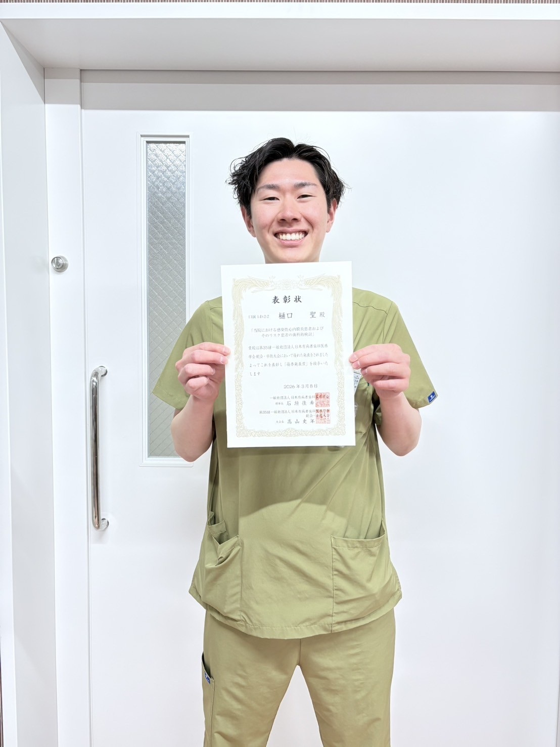 先日開催されました第 35回日本有病者歯科医療学会において、優秀賞の賞状が届きました。大変光栄に思うとともに、関係者の皆様に心より感謝申し上げます。