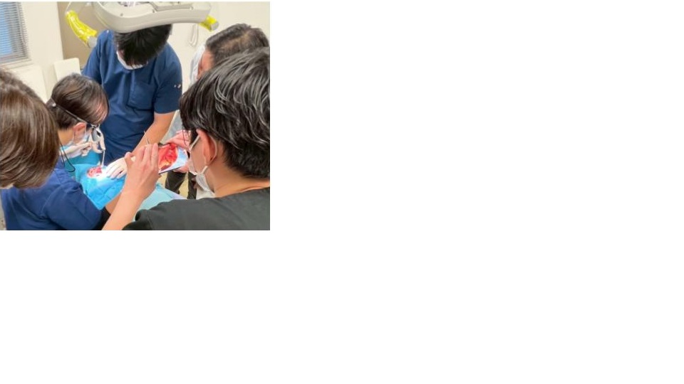 当科の非常勤講師であり、医療法人社団 富塚歯科医院の理事長である富塚 佳史先生をお招きし、前回は「GBR法を併用した右側上顎3部へのインプラント埋入手術」の実演を行なっていただき、増骨、インプラント体の埋入について解説・講演を行なっていただきました。今回はしの埋入後の処置として「結合組織移植術」を実演いただき、インプラント関連および歯周外科関連における解説・講演を行なっていただき、知識を深めることができました。