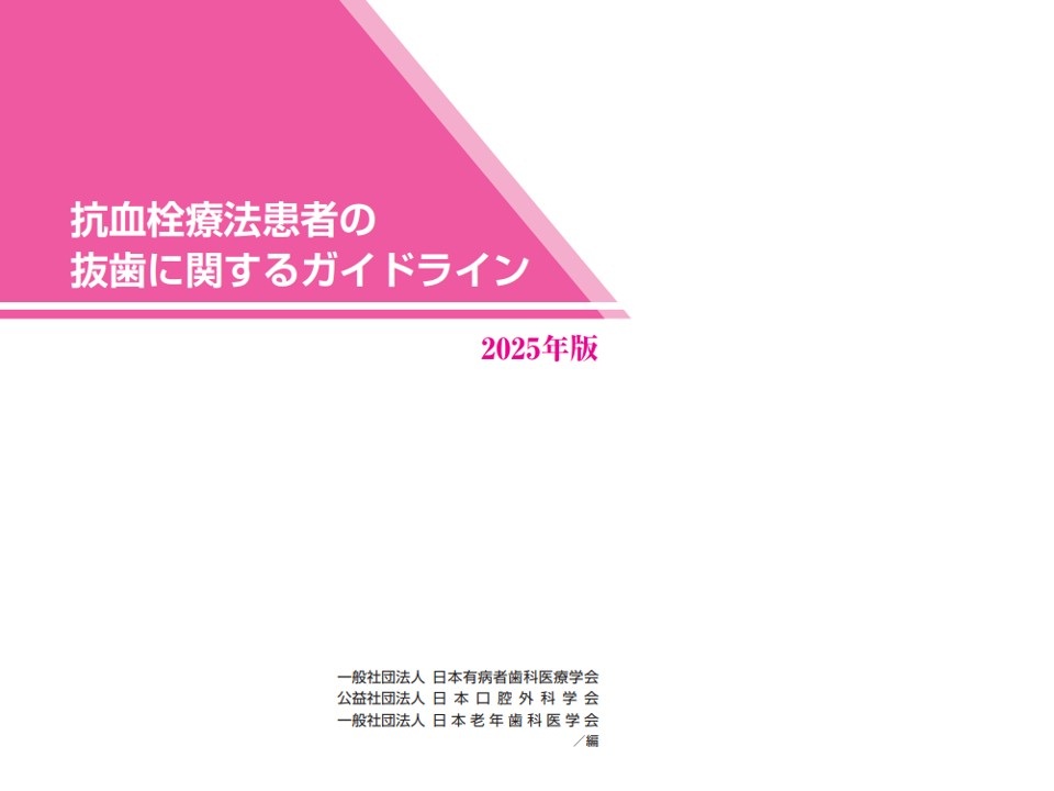 このたび、「抗血栓療法患者の抜歯に関するガイドライン 2025年版」が公表され、日本有病者歯科医療学会・日本口腔外科学会・日本老年歯科医学会の3学会合同ガイドラインとして、 日本有病者歯科医療学会のホームページに掲載されました。