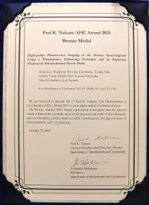 第66回日本組織細胞化学会総会・学術集会において、宮崎大学医学部 解剖学講座組織細胞化学分野の村上正基先生(客員教授)との共同研究の論文が第1回 Paul K. Nakane AHC Award 2025(中根一穂記念論文賞) Bronze medal を受賞しました。