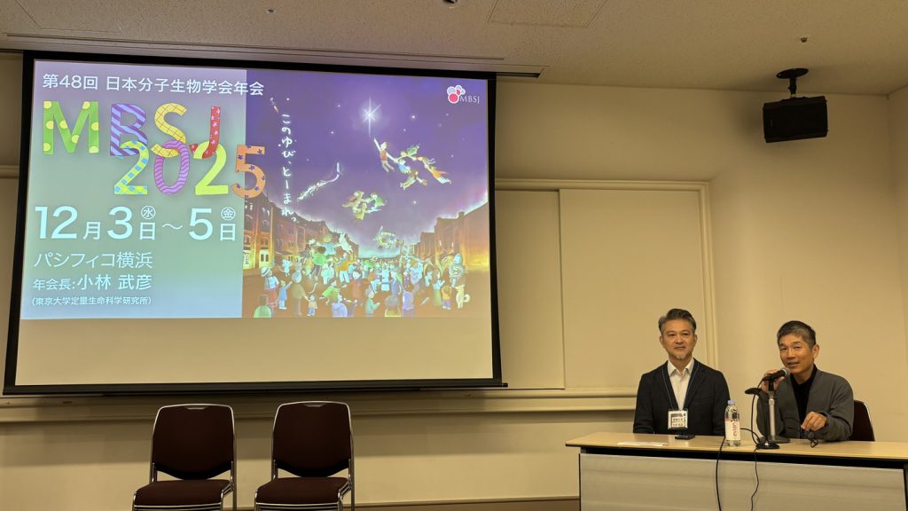 2025年12月8日 / 最終更新日時 : 2025年12月8日 MatsumotoJunko NEWS 分子生物学会 12/3-5に横浜で開催の第48回日本分子生物学会年会に今井教授、佐伯准教授、柳原助教、大学院生の齊田さんが参加しました。佐伯准教授はシンポジウム発表、柳原助教と齊田さんはポスター発表をしました。今井教授は佐伯准教授も発表したシンポジウムの座長を務めました。詳しくはこちら