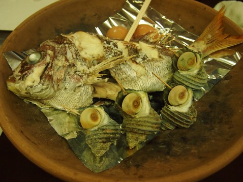 サイクリングで到着した大島の「いけす料理・海宿 千年松」という宿に宿泊しました。お部屋も温泉もオーシャンビューで、お部屋からは海の音が聞こえてくる素敵な宿でした。夜は宴会で、料理も大変豪華です。アコウやウニの刺身からはじまり、村上水軍ゆかりの鯛の炮烙薬、アワビステーキなどなど本当においしい料理でおなかいっぱいです。ビールやおいしい日本酒もたくさんいただきました。