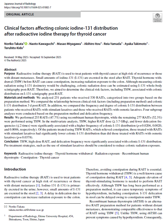 甲状腺癌に対する治療の1つである放射性ヨード内用療法では、治療で使用されるI-131の殆どが尿中に排泄されますが、一部は便中に排泄されます。したがって治療時に便秘がある場合は大腸の被ばくが増加する可能性があります。放射性ヨード内用療法を効果的に行う前処置として甲状腺ホルモン休薬を行った場合は甲状腺機能低下により便秘が生じやすくなるため、大腸の被ばくが増加する可能性が懸念されますが、腸管の蠕動運動により時間経過で移動するI-131や腸管の複雑な形状等様々な問題から、大腸の吸収線量を正確に評価することは困難でした。そこで本研究では大腸の線量を簡便に評価するため、放射性ヨード内用療法後に撮影するI-131シンチグラフィ像における大腸のI-131分布の「あり・なし」に着目し、放射性ヨード内用療法後の大腸I-131分布に影響を与える因子について評価を行いました。その結果、前処置の種類(甲状腺ホルモン休薬を行ったかどうか)の他、放射性ヨード内服後の排便回数、内服線量の多寡といった因子がI-131シンチグラフィ上(治療から3日後撮影)の大腸I-131分布の有無と有意に関連していました。また、大腸の被ばく線量を減少させるためには刺激性下剤を治療前の段階から使用するなどの戦略が有効である可能性が示唆されました。