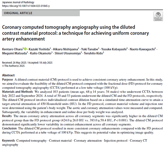 冠動脈CTアンギオグラフィ(CCTA)において、冠動脈の造影効果を均一に保つことは診断精度を左右する重要な要素です。従来広く用いられてきたfractional dose(FD)法は、体重に基づいて造影剤量を決定しますが、患者間で造影のばらつきが生じる課題がありました。