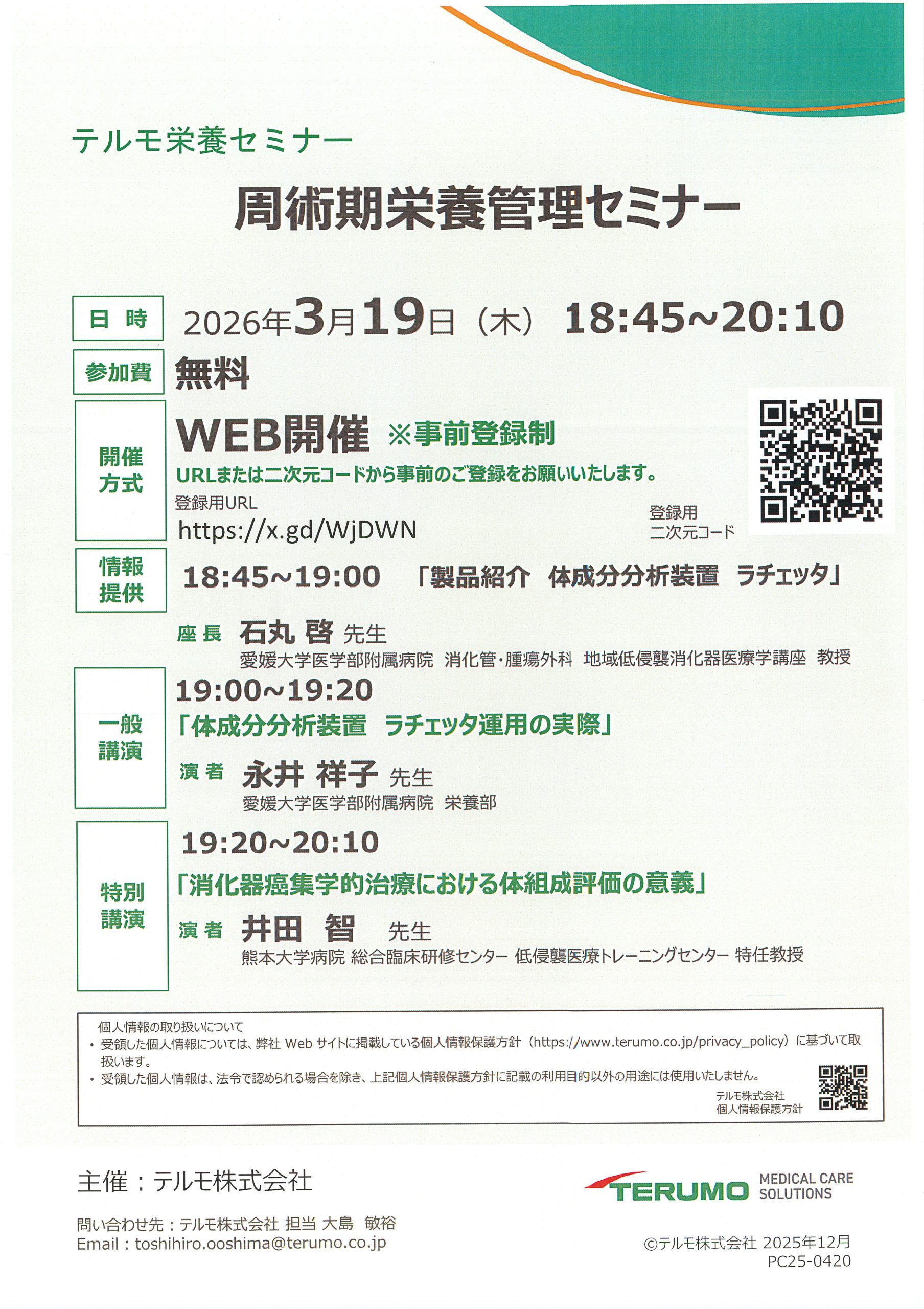 3月19日(木)テルモ栄養セミナー「周術期栄養管理セミナー」が開催されます。
