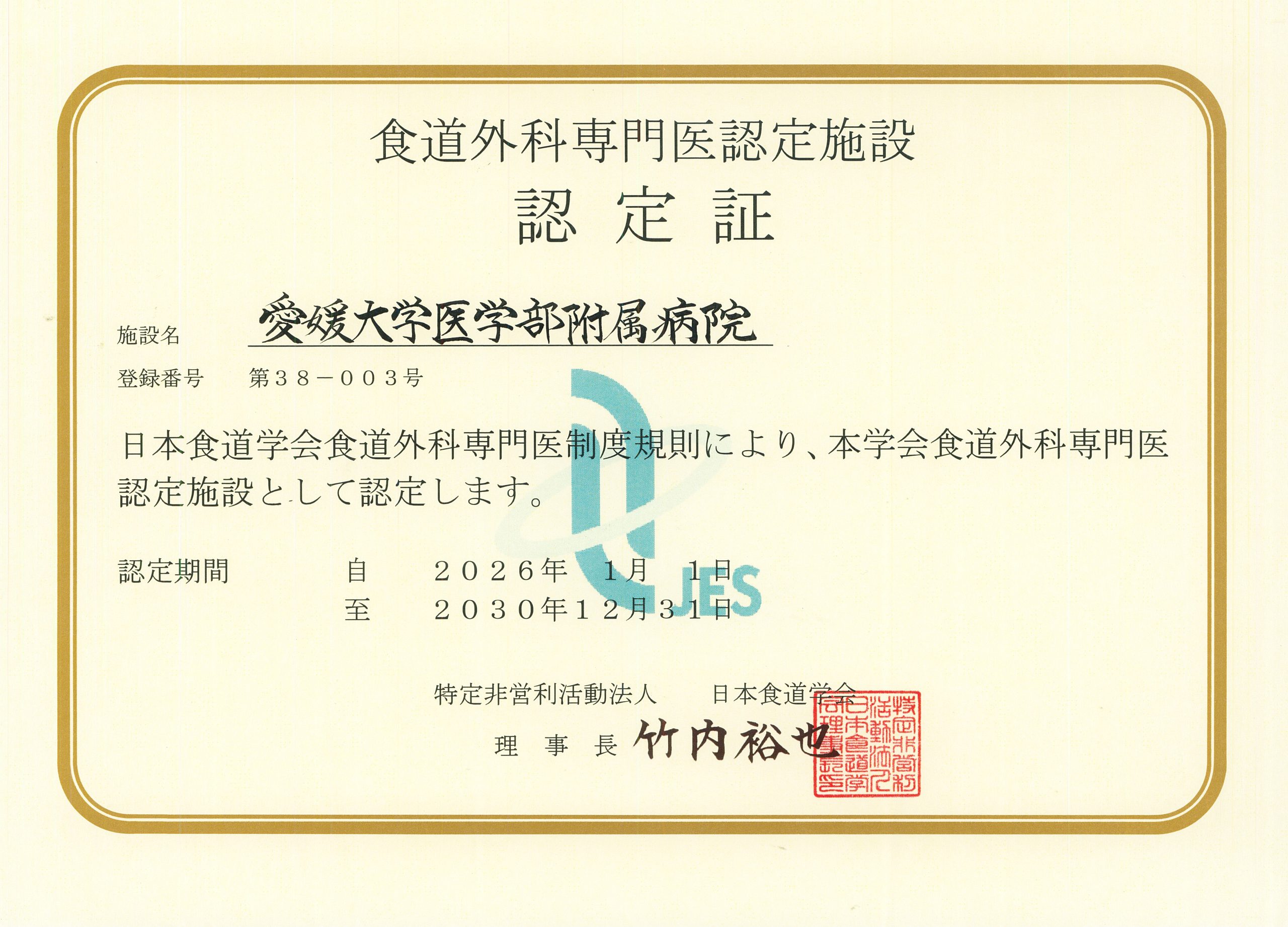 2026年1月1日(木) 愛媛大学医学部附属病院が食道外科専門医認定施設として認定されました。