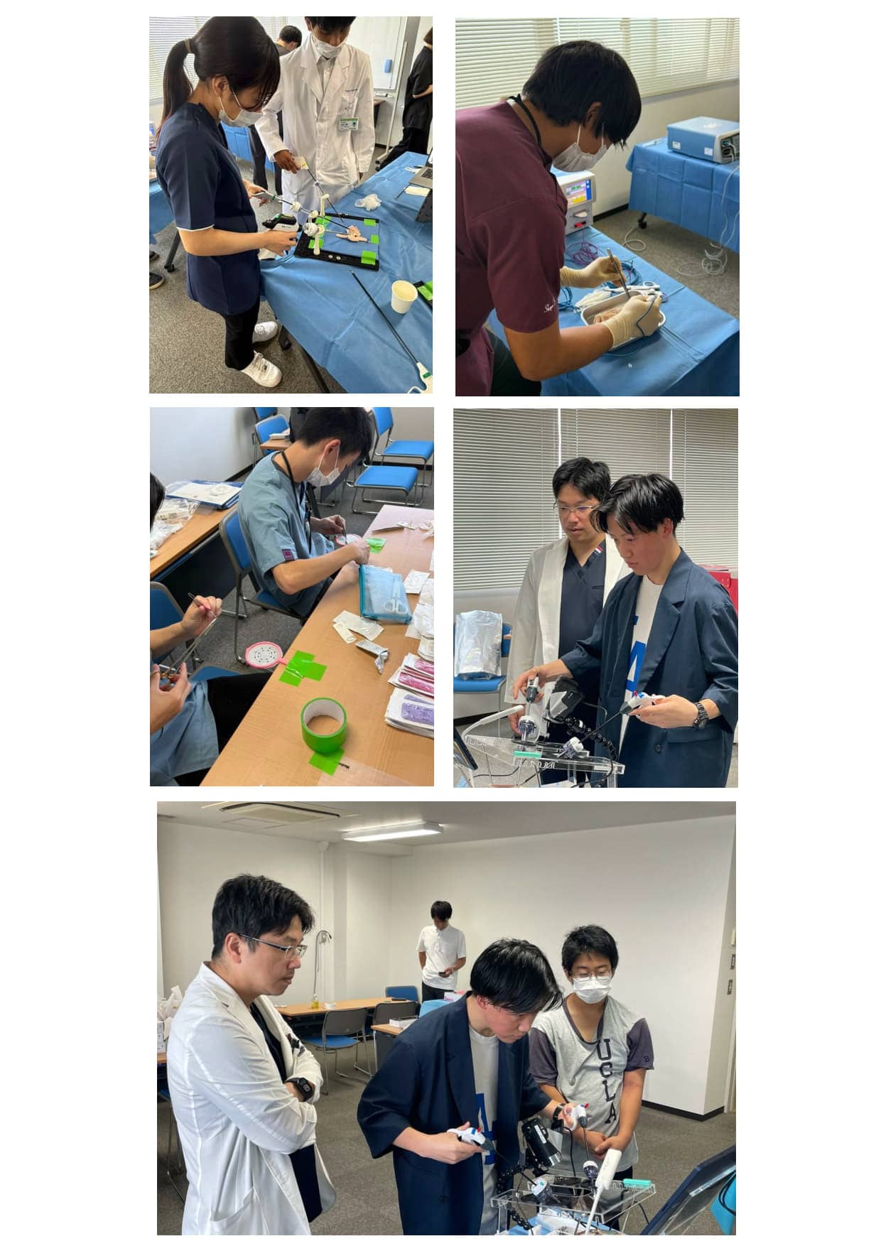 9月2日と9月14日に研修医、臨床実習の学生、全学年の医学生を対象にした、電気メス、自動縫合器、自動吻合器の使い方と、手術支援シミュレータを用いた胆嚢摘出術をおこなうハンズオンセミナーを開催しました。