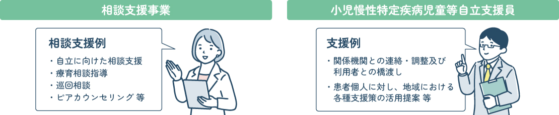 都道府県は、小児慢性特定疾病児童等自立支援事業として、小児慢性特定疾病児童等に対する医療及び小児慢性特定疾病児童等の福祉に関する各般の問題につき、小児慢性特定疾病児童等、その家族その他の関係者からの相談に応じ、必要な情報の提供及び助言を行うとともに、